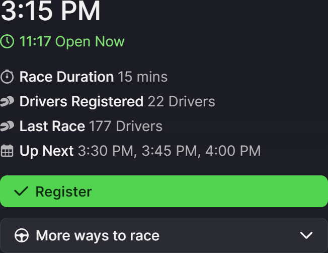 Once you click on the car's row, the list would animate up & show more information about all the cars competing, highlighting the currently selected one. Clicking the down arrow would return you to the car image view. I think an important thing to show here is the car class - I'm not sure this information is available anywhere else, and it'd be nice to know which cars are in which classes (basically what you're competing against). If only one car class is being raced in this series, I think this information can be omitted in both views.
